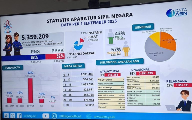 Jakarta, 1 September 2025 – Badan Kepegawaian Negara (BKN) merilis data terbaru mengenai jumlah Aparatur Sipil Negara (ASN) di Indonesia. Berdasarkan laporan per 1 September 2025, total ASN tercatat mencapai 5.359.209 orang. Angka ini terdiri atas 3.634.413 Pegawai Negeri Sipil…